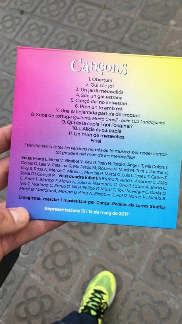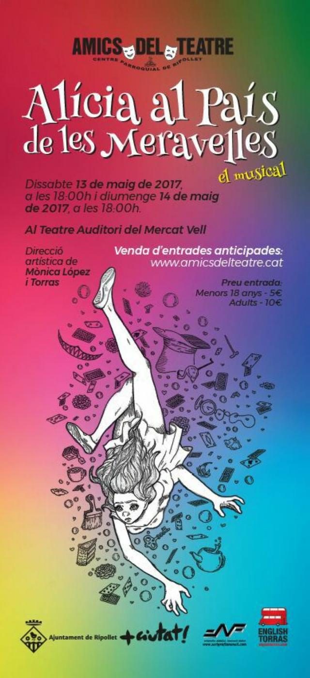 Aquest dissabte, 13 de maig, Amics del Teatre dóna el tret de sortida de la seva temporada d'espectacles. Ho farà amb un plat fort, un musical basat en el llibre Alícia al País de les Meravelles, de Lewis Carroll. Es tracta d'una obra musical dirigida per Mònica López i adaptada per Jordi Rodríguez. L'entitat ha preparat una gran sorpresa per als assistents a les sessions d'aquest cap de setmana. Ha editat un CD amb les cançons del musical. Així que tothom qui vulgui podrà adquirir aquest disc i gaudir de l'obra a casa seva.