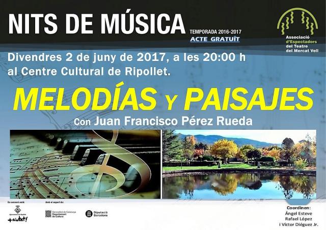 El 2 de juny, les Nits de Música oferiran una sessió especial titulada Melodies i paisatges. L'activitat anirà a càrrec del ripolletenc Juan Francisco Pérez Rueda, antic col·laborador de Ripollet Ràdio. L'acte tindrà lloc al Centre Cultural a partir de les 20 hores.