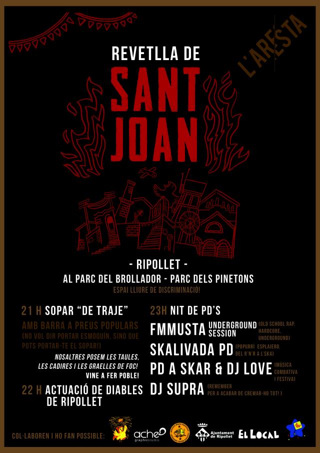 L'associació de joves L'Aresta ha organitzat una revetlla de Sant Joan "popular, no consumista i inclusiva", que tindrà lloc al brollador del parc dels Pinetons. La celebració, oberta a totes les edats i públics, es declara "espai lliure de discriminació". Segons van explicar a la presentació de l'activitat, és fruït de la tasca d'autogestió que duu a terme l'entitat, creada a principi d'aquest any amb l'objectiu de "fer poble" i el "treball horitzontal" amb altres col·lectius locals.