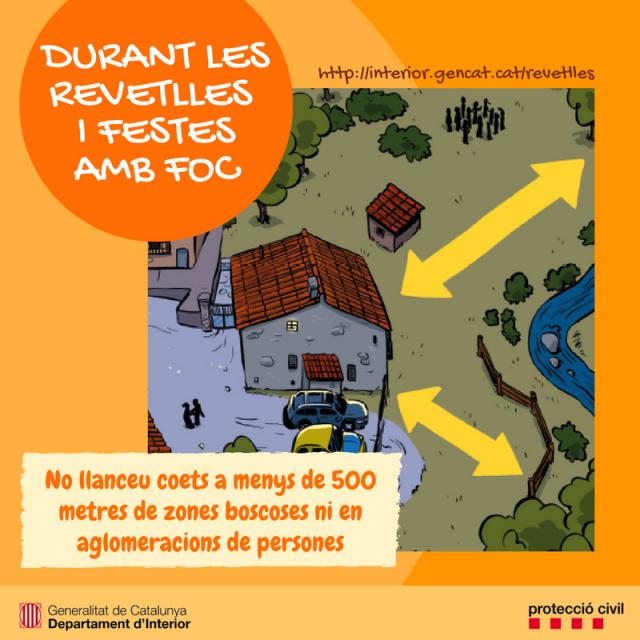 No es poden llançar coets, globus o altres artefactes que continguin foc a menys de 500 metres del bosc, ni s'ha de tirar cap coet amb la mà, ni amb la canya trencada, perquè sortirà en una direcció inesperada i pot explotar malament.