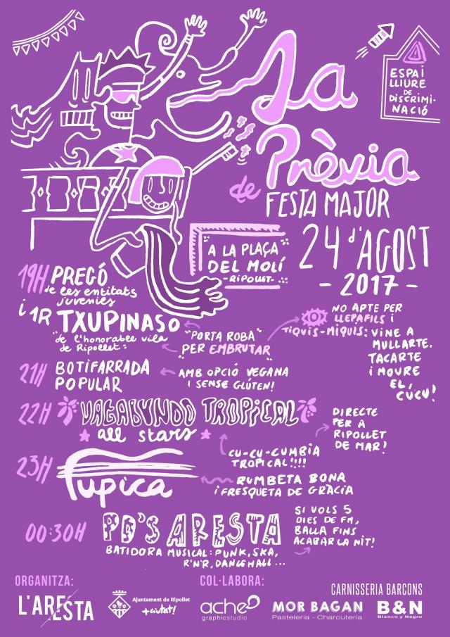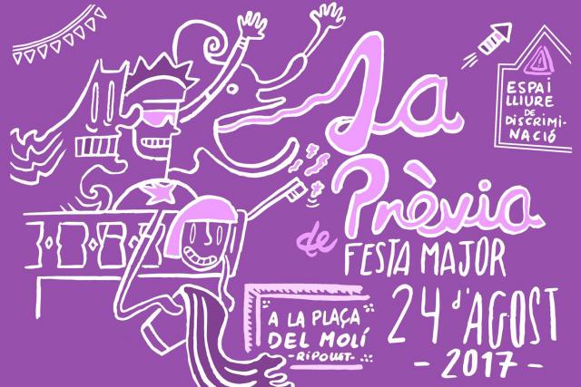 La Festa Major d'enguany comptarà per primera vegada amb una jornada prèvia, que se celebrarà a la plaça del Molí aquest dijous 24 d'agost. La Prèvia està organitzada per L'Aresta i es defineix com a "autogestionada, lliure de discriminació i sense pèls a la llengua". La vetllada començarà a les 19 hores, amb un pregó d'entitats juvenils i el primer Txupinaso de la història de la Festa Major de Ripollet. L'Aresta recomana als assistents portar roba vella, que es pugui embrutar.