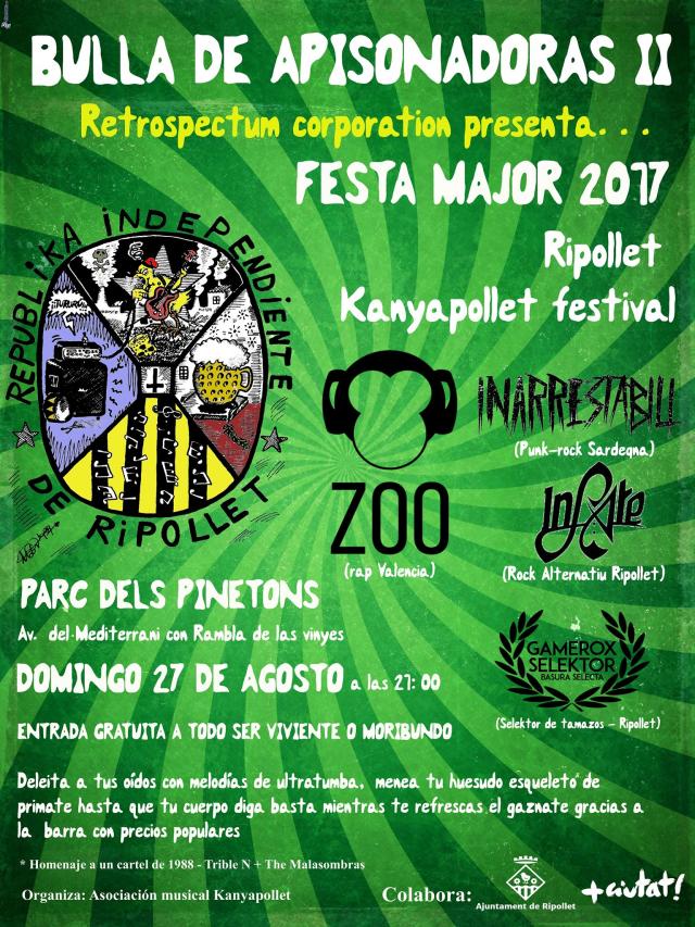 Abans, però, tocarà el grup italià Inarrestabili "per donar-li un toc més internacional a l'esdeveniment". Tot i ser de l'illa de Sardenya, no són desconeguts per als ripolletencs, ja que durant una etapa de la vida van viure a Ripollet, amb cinc discos a l'esquena i compartint escenari amb bandes com Banda Bassotti, Lendakaris Muertos o Talc. Fan un punk-rock animat, cantat en Italià i algunes versions en castellà o anglès. També hi actuarà el grup local Infate, "amb un estil que es decanta entre el rock, el pop i el punk alternatiu, amb lletres en anglès" i un estil que "pot recordar-nos una mica als Red Hot Chili Peppers". Una altra actuació local serà la del DJ Gamerox Selektor, el qual tancarà la nit i "punxarà els temes més animats perquè el públic no pari de ballar".