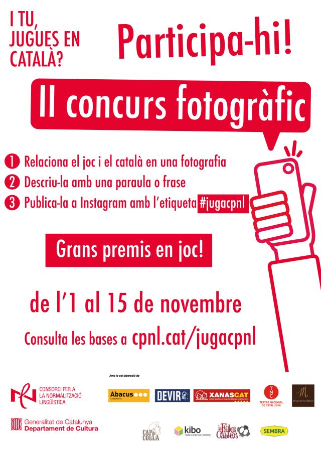 El Consorci per a la Normalització Lingüística (CPNL) impulsa un any més actuacions de promoció dels jocs i les joguines en català, a través del programa I tu, jugues en català?. En aquesta cinquena edició del programa, es repeteix l'experiència del concurs fotogràfic que enguany té Instagram com a xarxa social de referència. De l'1 al 15 de novembre, les persones interessades poden participar-hi publicant fotografies a Instagram que relacionin el joc i el català. Les fotografies han de ser sobre el joc i han de dur una breu descripció, una frase o paraula, en català. A més, s'han d'etiquetar com a #jugacpnl.