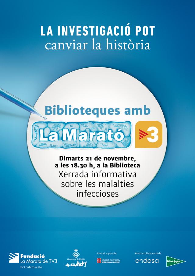 Per primera vegada, la Biblioteca de Ripollet s'ha sumat a la campanya de difusió i sensibilització social que precedirà La Marató a TV3 i Catalunya Ràdio, que se celebrarà el diumenge 17 de desembre i que en la seva 26a edició estarà centrada en les malalties infeccioses. Així, aquest dimarts, 21 de novembre a les 18.30 h, la Biblioteca acollirà una xerrada sobre les malalties infeccioses. La conferència està adreçada al públic en general i és gratuïta.