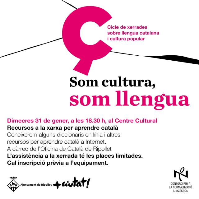 El "Som cultura, som llengua" està organitzat per l'Oficina de Català de Ripollet i el Patronat Municipal de Cultura. Les pròxima xerrada que es farà (el 28 de febrer)serà sobre el Cabraboc i el Carnastoltes a Ripollet i anirà a càrrec dels Diables de Ripollet. Fins ara s'han fet una xerrada sobre el doblatge en català i una visita a la Mostra de Pessebres de Ripollet.