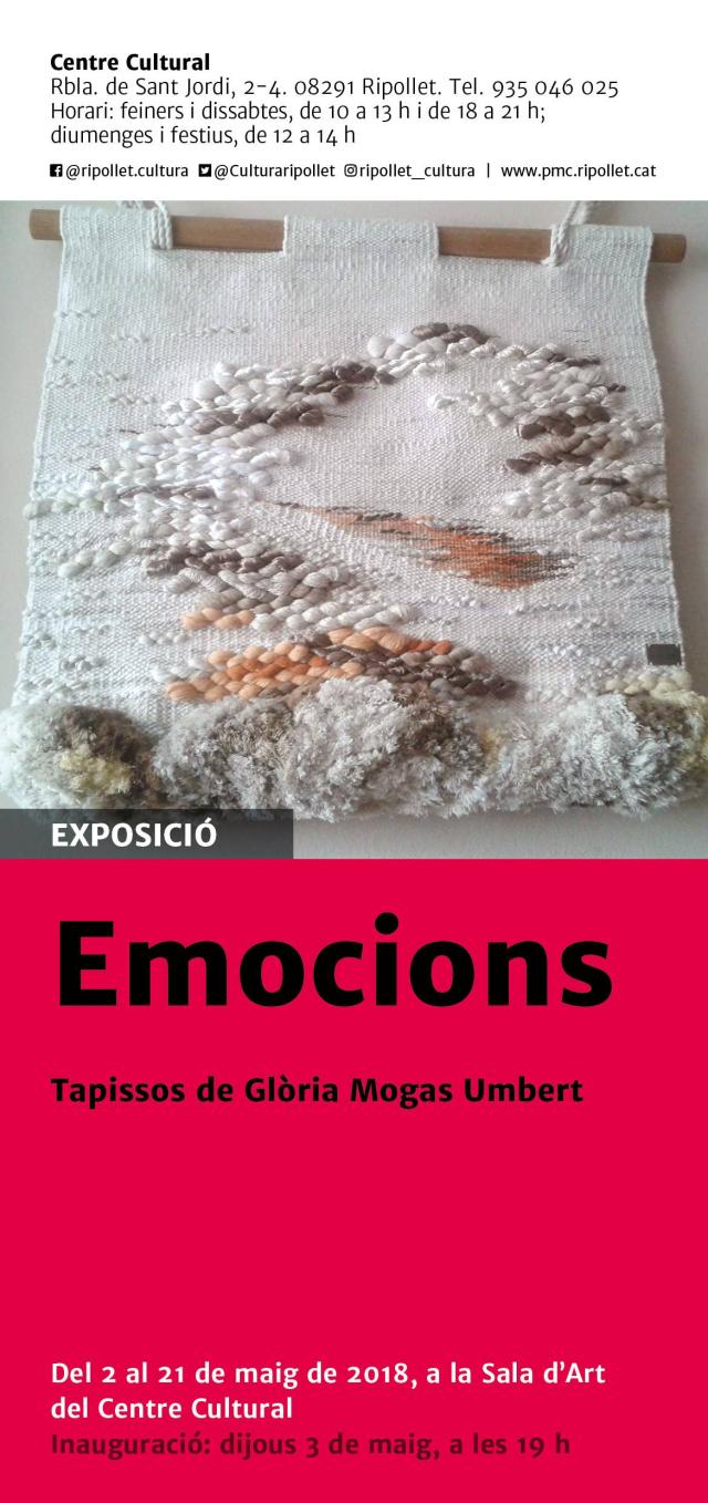 El Centre Cultural acull, fins al 21 de maig, l'exposició "Emocions. Tapissos de Glòria Mogas Umbert". Aquest dijous, dia 3, a les 19 h, s'inaugurarà oficialment la mostra, que porta fins a la Sala d'Art els tapissos de la ripolletenca Glòria Mogas Umbert.