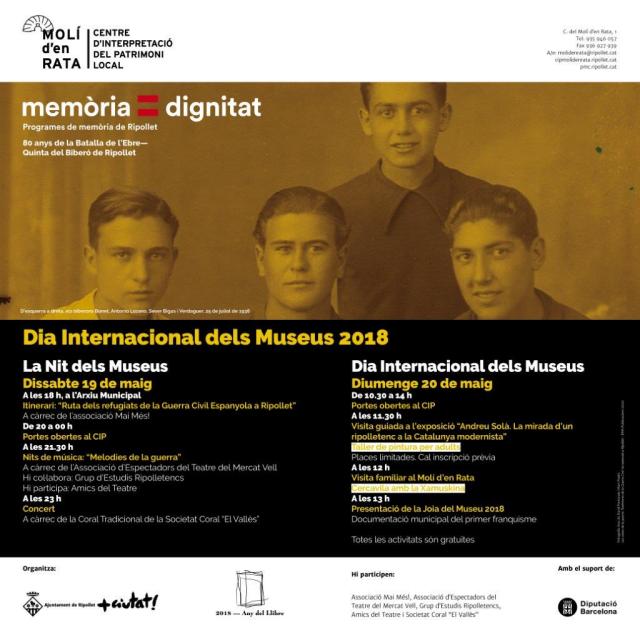 Els 80 anys de la Batalla de l'Ebre, com hem dit, també marcaran els actes del Dia Internacional dels Museus. Especialment la tarda-vespre de dissabte, que se celebra La Nit dels Museus i comptarà, entre altres activitats, amb una ruta per parlar dels refugiats de la Guerra Civil Espanyola a Ripollet a càrrec de l'Associació Mai Més! i unes nits de música especials sota el títol "Melodies de la Guerra".