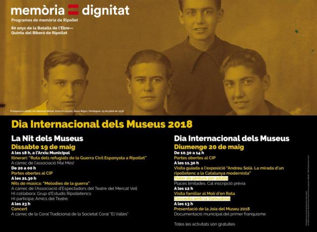 La Guerra Civil Espanyola estarà molt present als actes del Dia Internacional dels Museus, especialment la tarda-vespre de dissabte, que se celebra La Nit dels Museus i comptarà, entre altres activitats, amb una ruta per parlar dels refugiats de la Guerra Civil Espanyola a Ripollet a càrrec de l'Associació Mai Més!. També hi haurà una sessió especial de Nits de música, sota el títol "Melodies de la Guerra", amb la col·laboració del Grup d'Estudis Ripolletencs i Amics del Teatre. Una jornada en la que el punt final el posarà la Coral Tradicional de la Societat Coral "El Vallès".