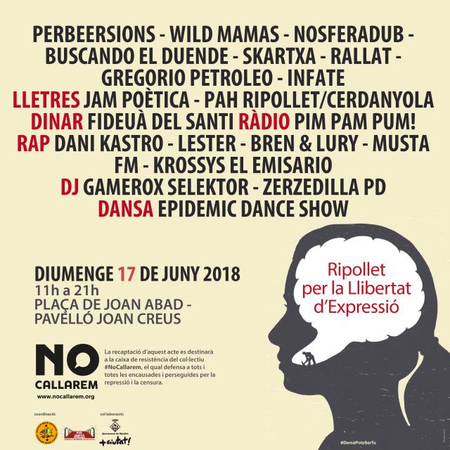 El grup de suport de Ripollet a la plataforma No Callarem organitza, el diumenge, 17 de juny, a la plaça de Joan Abad, la Jornada No Callarem per la llibertat d'expressió a Ripollet. L'objectiu d'aquesta diada, segons s'explica en nota de premsa, és "denunciar l'autoritarisme i la censura", així com "les recents condemnes i sancions a músics, actors, periodistes i tuitaires". Sota la coordinació de l'associació musical Kanyapollet i el col·lectiu Mai Més!, la jornada aplegarà, en un mateix escenari, diverses disciplines artístiques, com ara música, dansa i literatura, des de les 11 fins a les 21 h.