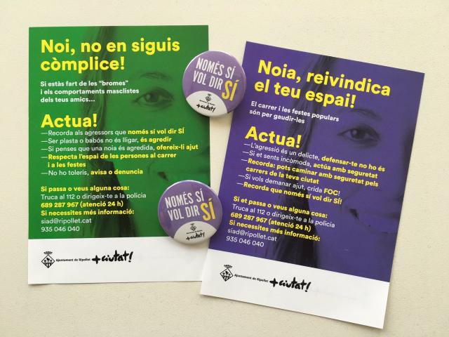 L'Ajuntament de Ripollet ha posat en marxa la campanya contra la violència masclista "Només sí vol dir sí", amb l'objectiu que nois i noies, en cas de detectar comportaments masclistes, alcin la veu. A més de trucar al 112 o dirigir-se a la policia, es posa a disposició de tothom un telèfon d'atenció 24 h: 689 287 967. també s'instal·larà un punt-lila LGTBI al ball del Confeti, el 27 d'agost.