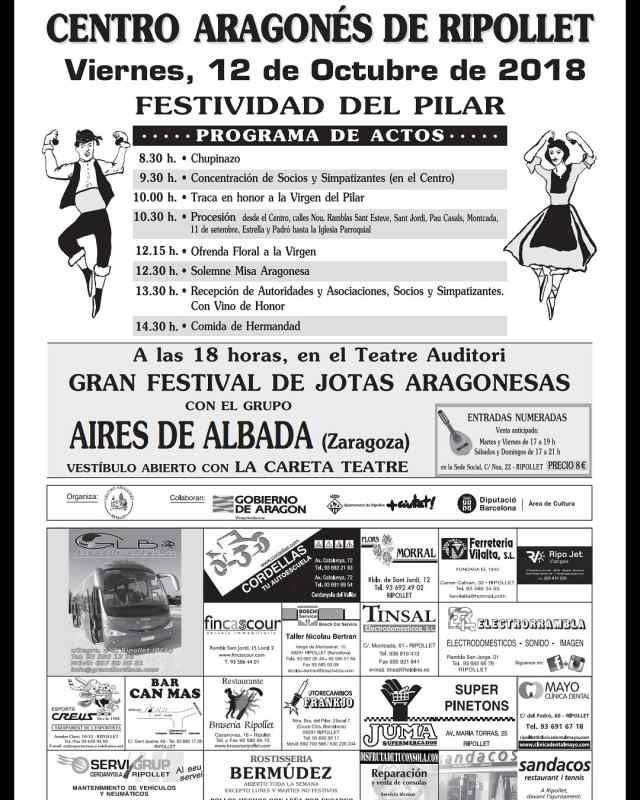 El Dia del Pilar, divendres 12 d'octubre, tindrà lloc la tradicional processó, seguida de l'ofrena floral a la Verge del Pilar i la missa. En acabat, es durà a terme el festival de jotes, amb la participació dels saragossans Asociación Folklórica Aire de Albada.