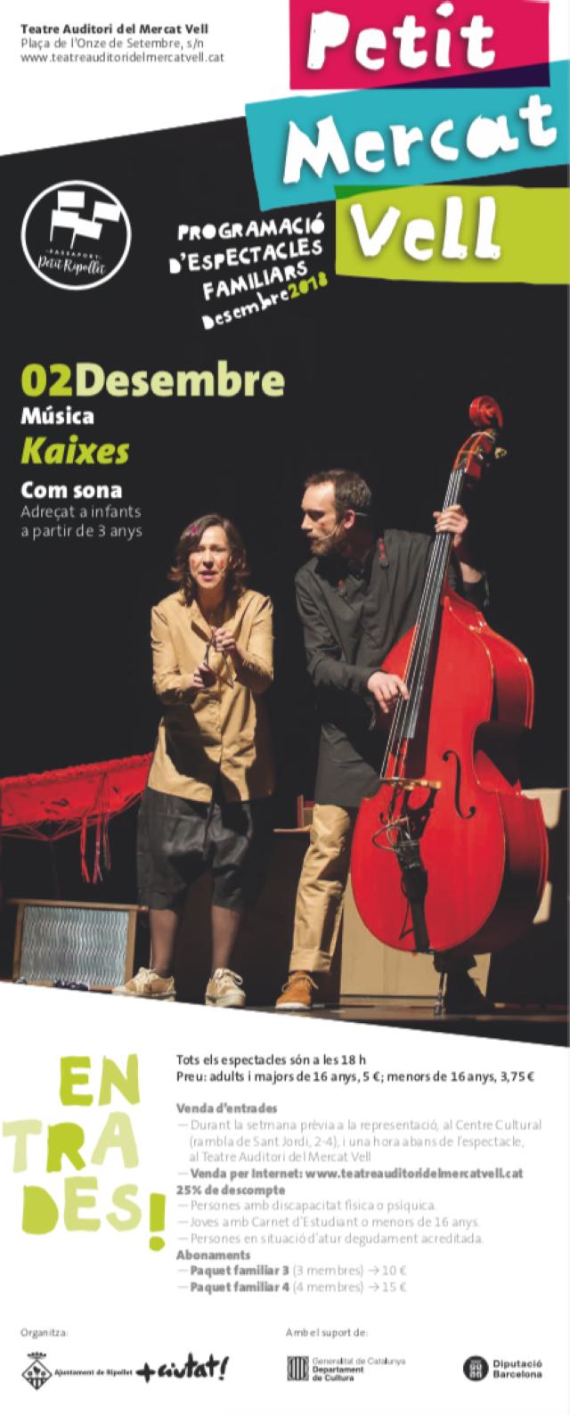 El 2 de setembre, a les 18 h, el Teatre Auditori acollirà la darrera producció de la companyia Com Sona: "Kaixes". L'espectacle combina la música popular i la cançó d'autor, on cadascuna de les peces esdevé un joc a través del teatre d'objectes. També s'adreça a infants a partir de 3 anys.