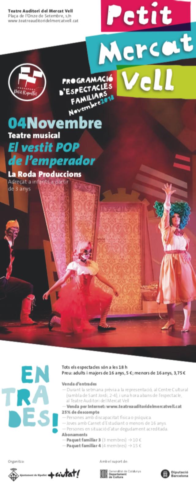"El vestit POP de l'Emperador" arribarà al Teatre Auditori diumenge 4 de novembre, a les 18 h, a càrrec de Roda Produccions. Aquesta obra de teatre musical amb molt d'humor, per a infants a partir dels 3 anys, narra la història d'un emperador a qui li agraden molt els vestits i vol fer-se un d'únic per a la gran passarel·la anual de la reialesa.