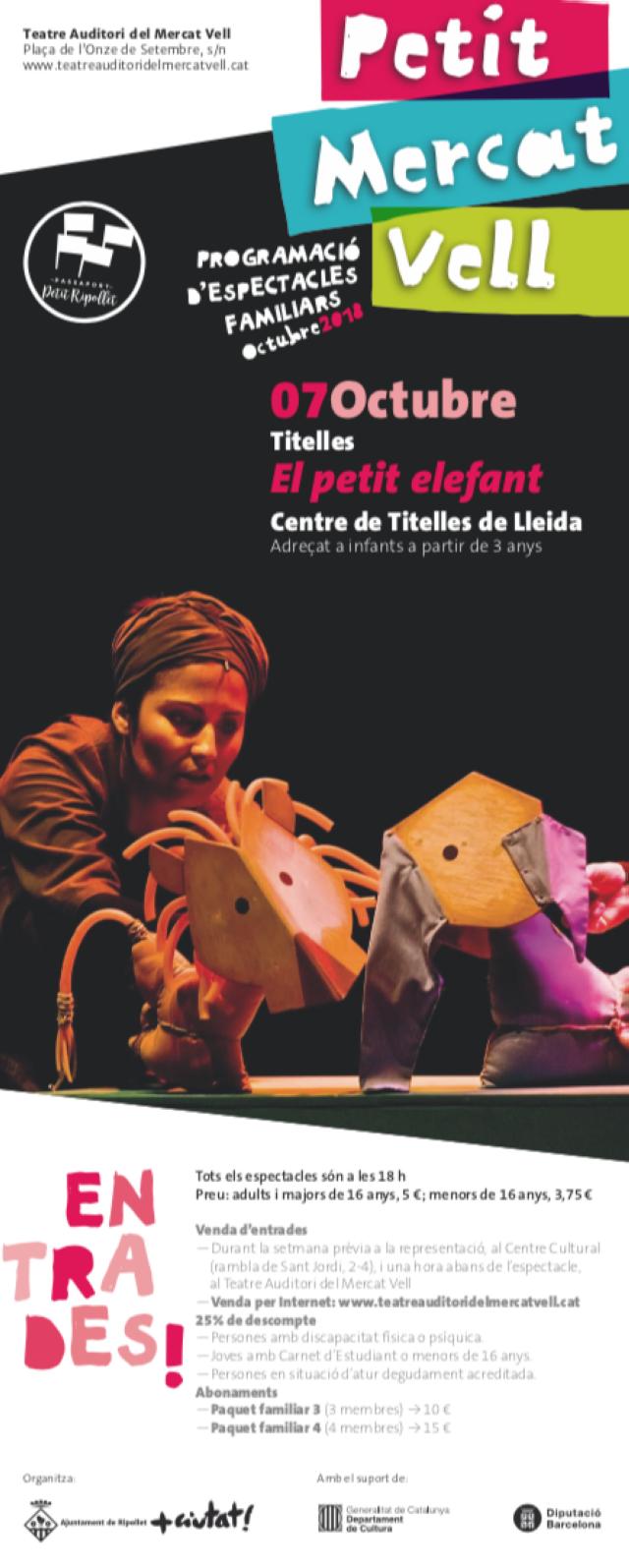 Una temporada més, l'Ajuntament de Ripollet porta al Teatre Auditori el cicle d'espectacles infantils "Petit Mercat Vell", que compta amb el suport de la Generalitat de Catalunya i la Diputació de Barcelona. Aquest diumenge, 7 d'octubre, arrenca la programació amb l'objectiu de convertir aquest equipament del municipi en un referent de les arts escèniques per a públic familiar i infantil. Les obres, una al mes, estan adreçades a infants a partir de 3 anys i inclouen espectacles de titelles, teatre musical i música.