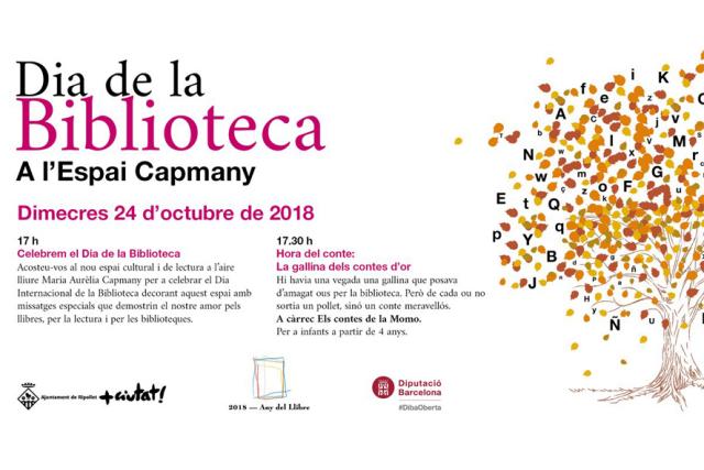Enguany, per a celebrar aquest dia s'organitzarà l'activitat "Jo estimo els llibres", a les 17 h, en què es decorarà l'Espai Capmany amb missatges especials que demostrin el nostre amor pels llibres, per la lectura i per les biblioteques. A continuació, a les 17.30 h, Els contes de la Momo s'encarregarà de l'Hora del Conte "La Gallina dels contes d'or", per a infants a partir de 4 anys. Explica la història d'una gallina que ponia d'amagat ous per tota la biblioteca, però de cada ou no sortia un pollet, sinó un conte meravellós.