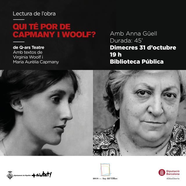 Avui dimecres, 31 d'octubre, a les 19 h,la Biblioteca acollirà l'espectacle "Qui te por de Capmany i Woolf?", un monòleg dirigit per Tilda Espluga i interpretat per l'actriu Anna Güell, que aplega dos textos: una conferència que Virginia Woolf va pronunciar en una Societat de dones el 1931 i una carta que Maria Aurèlia Capmany va publicar l'any 1971. Aquests textos, vestits d'intel·ligència, ironia i diversió, serveixen per a reflexionar al voltant del paper de les dones en l'escriptura i de la seva lluita per la igualtat social i econòmica.