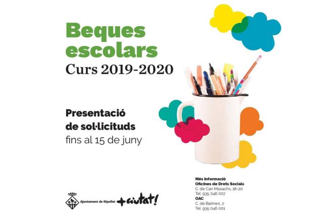 Fins al pròxim 15 de juny es poden presentar les sol·licituds de beques escolars per al curs 2019-2020, tant de menjador com per a l'adquisició de llibres i/o material escolar. Poden optar-hi les famílies dels alumnes empadronats a Ripollet que cursin de P3 a 4t d'ESO. Les sol·licituds es poden fer telemàticament o de forma presencial.