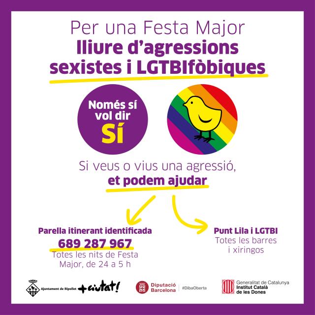 Com ja s'havia anat avançant, aquesta Festa Major tindrà un fort component de gènere, consolidat en un Protocol d'agressions sexistes i lgtbifòbiques, un programa d'acció que engloba formació al personal de l'Ajuntament i d'entitats, la disponibilitat d'informació i ajuda a totes les barres i xiringuito, un punt lila itinerant en forma de parella i la col·laboració amb la Policia Local i Mossos d'Esquadra. El protocol, que serà present a tots els espais a través d'una campanya informativa.