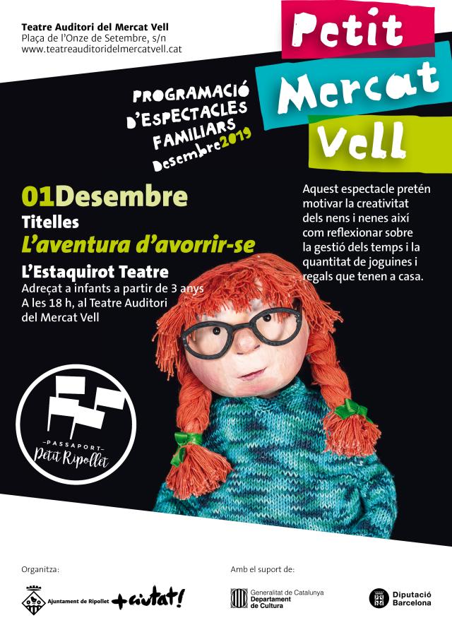 Finalment, l'1 de desembre comptarem amb uns habituals a Ripollet, la companyia l'Estaquirot Teatre amb el seu darrer espectacle 'L'aventura d'avorrir-se'. Adreçat a partir de 3 anys. La protagonista d'aquesta història és una nena que tot i tenir moltes joguines, sempre s'avorreix i no sap jugar sola. Però un dia a casa de l'àvia, amb un simple aneguet de goma comença una aventura que la portarà a viatjar amb la imaginació a un món dels colors. Aquest espectacle pretén conscienciar a les famílies de la quantitat de joguines i regals que tenen a casa i motivar la creativitat dels infants.