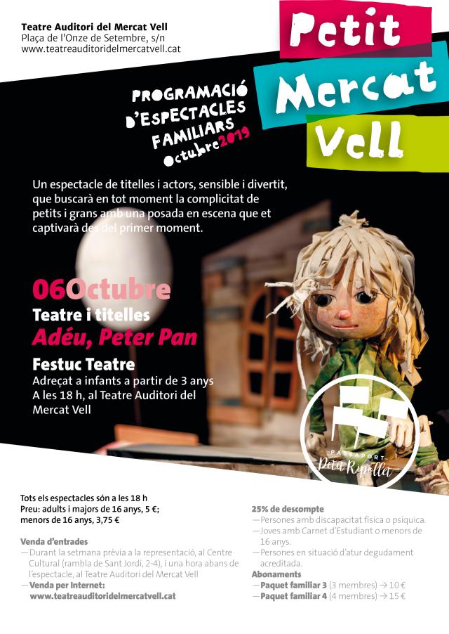 L'Ajuntament comença el pròxim diumenge, 6 d'octubre, la programació d'espectacles familiars al Teatre Auditori del Mercat Vell. Es tracta del Petit Mercat Vell, un programa que porta espectacles per a públic familiar tots els primers diumenges de mes, d'octubre a maig, i converteix el Teatre Auditori en un punt de trobada per a famílies i infants que gaudeixen amb les arts escèniques. El tret de sortida serà el pròxim 6 d'octubre amb un dels fenòmens de la temporada passada, 'Adéu Peter Pan' de Festuc Teatre.