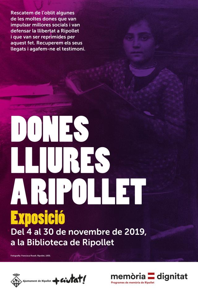 "Moltes vegades quan es fa memòria es posa el focus en l'home, en el front, i nosaltres volem posar la mirada en les dones, que també van patir molta repressió i van ser una part molt important d'aquests temps", va explicar el regidor de Memòria Històrica i Joventut, Pablo López, durant la presentació del programa el passat dilluns, 28 d'octubre. En aquest sentit, l'exposició Dones Lliures, promoguda pel Comitè de dones, té la voluntat de recuperar de l'oblit algunes dones vinculades a Ripollet, que com moltes altres, van contribuir a les millores socials i van defensar la llibertat a Ripollet, sent reprimides per això. Aquesta exposició anirà acompanyada de l'acte de reconeixement a la Reyes Jiménez Bigas, com a testimoni viu de totes aquestes dones. També amb la xerrada sobre la història del moviment feminista a Ripollet, a càrrec d'Helena Bea.