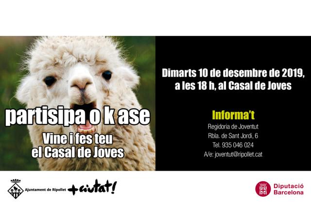 La Regidoria de Joventut de l'Ajuntament de Ripollet ha engegat un procés participatiu per a l'elaboració d'un pla d'usos del Casal de Joves. Aquest procés compta amb el suport de la Diputació de Barcelona mitjançant la consultoria Indic, Iniciatives i Dinàmiques Comunitàries. El Pla d'usos pretén que el Casal de Joves esdevingui un espai de referència per a les persones joves del Municipi, donant resposta a les seves necessitats i creant un espai de trobada, d'intercanvi, de solidaritat, de participació i de compartir experiències. Amb l'objectiu de recollir les seves opinions i propostes, la Regidoria de joventut ha organitzat dues sessions participatives els pròxims dies 10 i 11 de desembre, al casal de Joves.