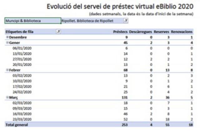 Des del tancament de la Biblioteca municipal de Ripollet, el passat dijous 12 de març, a causa de la situació d'emergència sanitària generada per la COVID19, l'equipament, que no ha deixat de donar servei, ha experimentat un fort creixement pel que fa al préstec de llibres electrònics a través de la plataforma eBiblio. Un resultat, en part, gràcies a la tasca de promoció que la Biblioteca ha fet per donar a conèixer la seva oferta de productes virtuals, així com el seu funcionament. Durant aquestes setmanes de confinament, el préstec de llibres electrònics a través de la plataforma eBiblio és el servei que està gaudint de més demanda i ha experimentat un fort creixement. Només des del 16 de març, el servei ha augmentat en més d'un 340% en préstecs virtuals. Mentre a principis d'any se servien una quarantena de títols mensuals, al mes de març s'han enregistrat fins a 155 títols de llibres digitals prestats (consulteu taula de dades a la imatge adjunta).