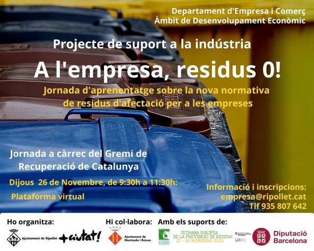 Dins la Setmana Europea de la Prevenció de Residus, s'han plantejat diferents accions comunicatives de sensibilització, a través de les xarxes socials, i un webinar, el pròxim 26 de novembre, sota el títol 'A l'empresa, residus 0!'. A la sessió, impartida pel Gremi de Recuperació de Residus de Catalunya, es tractaran temes com ara els fluxos dels residus, els processos de gestió o la normativa aplicable, tenint en compte que es preveuen canvis en la legislació europea i un enduriment de les mesures en matèria de residus, que afectarà a les empreses industrials, entre d'altres. Aquesta conferència online forma part del projecte 'Suport a la indústria local' de la Diputació de Barcelona, que l'Ajuntament de Ripollet executa en conveni amb Montcada i Reixac, per això es dirigeix, especialment, a empreses de polígons d'ambdues poblacions.