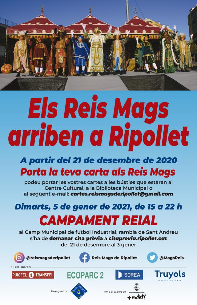 L'entitat local Ripollet Costums i Tradicions ha rebut, un any més, el suport de l'Ajuntament perquè torni la màgia a Ripollet la nit de Reis. Enguany, donades les restriccions i les mesures de seguretat per la COVID-19, ses majestats no podran fer l'habitual cavalcada, però instal·laran un campament reial al Camp Municipal de futbol Industrial. Les famílies podran visitar-lo, amb cita prèvia, que es podrà sol·licitar a partir del pròxim 21 de desembre. Ses majestats han volgut que les novetats d'enguany vagin desvetllant-se a mesura que s'apropa el dia 5 de gener i han manifestat la seva voluntat d'arribar a totes les llars.