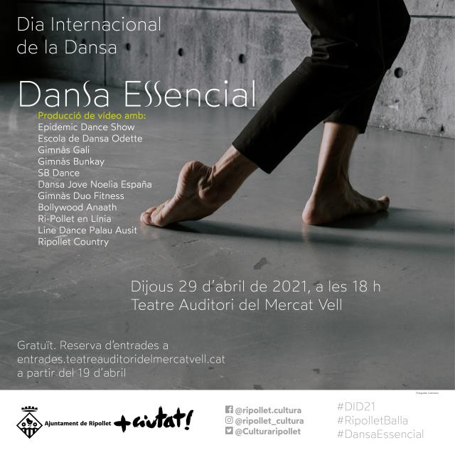 Després de l'anterior edició del DID en què estàvem confinats, ara es recupera la presència a través d'una producció audiovisual gravada que es podrà visualitzar el proper 29 d'abril, a les 18 hores, al Teatre Auditori del Mercat Vell. Un muntatge visual col·lectiu en el que han participat una desena d'entitats, centres i gimnasos locals, i en el que podrem trobar peces, gravades aquests dies en un entorn segur com és el Teatre, i fragments de passades actuacions. Aquesta producció, anomenada 'Dansa Essencial', ens ha permès oferir la possibilitat a les entitats de tornar a assajar, i en alguns casos, retrobar-se amb l'escenari, permetent d'alguna manera que, malgrat les circumstàncies actuals, no es perdi l'essència del DID. 'Dansa Essencial' tindrà un únic passi el dijous 29 d'abril, a les 18 h, al Teatre Auditori, l'aforament serà reduït i les entrades gratuïtes es podran reservar al web teatreauditoridelmercatvell.cat.