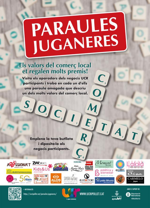 La Unió de Comerciants de Ripollet arrenca la campanya "Paraules juganeres", que durarà fins al 19 de maig, i que consistirà en buscar les paraules amagades als aparadors dels comerços adherits a la UCR. Qui hi vulgui participar haurà d'omplir una butlleta amb les paraules que trobi, que descriuen els valors del comerç local. Entre els participants que encertin com a mínim un 75% de les paraules es sortejaran tot de premis que inclouen un xec regal de 300€ a bescanviar als negocis participants, a més de regals patrocinats pels establiments participants.