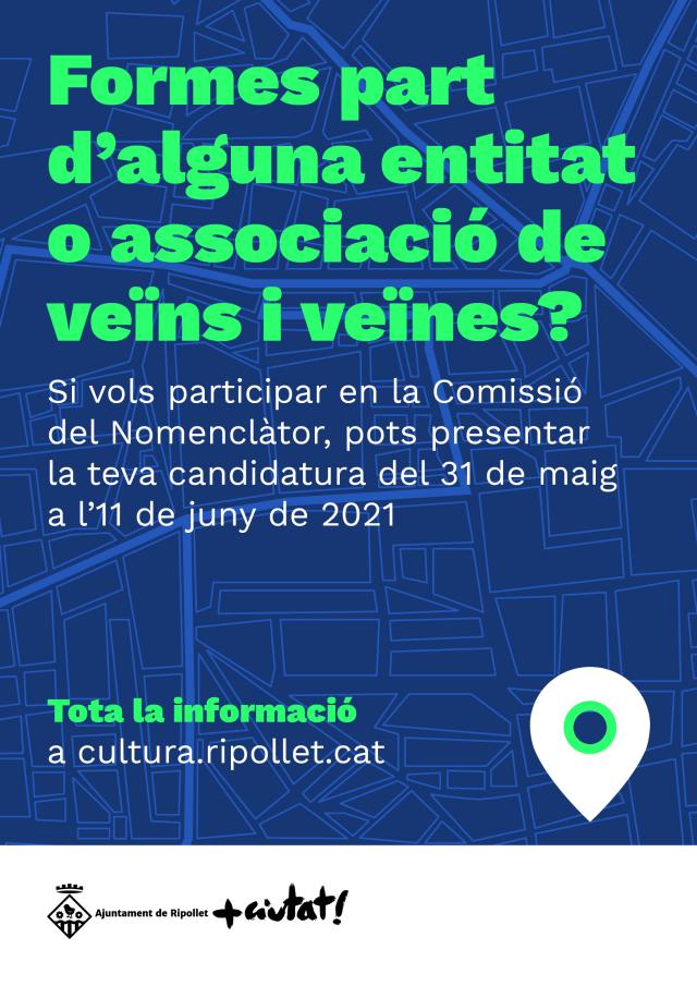 El Ple del passat 24 de setembre de 2020 va aprovar el Reglament Municipal de Nomenclàtor de Ripollet, arran d'una moció impulsada pel Jovent Republicà de Ripollet, per tal de feminitzar i dignificar el nomenclàtor. Ara, un cop aprovat aquest reglament, s'obre el període de presentació de les candidatures dels/les membres que formaran part de la Comissió de Nomenclàtor. Aquesta Comissió tindrà l'objectiu de nomenar les vies urbanes, espais públics d'interès, equipaments municipals i edificis amb valor històric i/o patrimonial de la ciutat.
