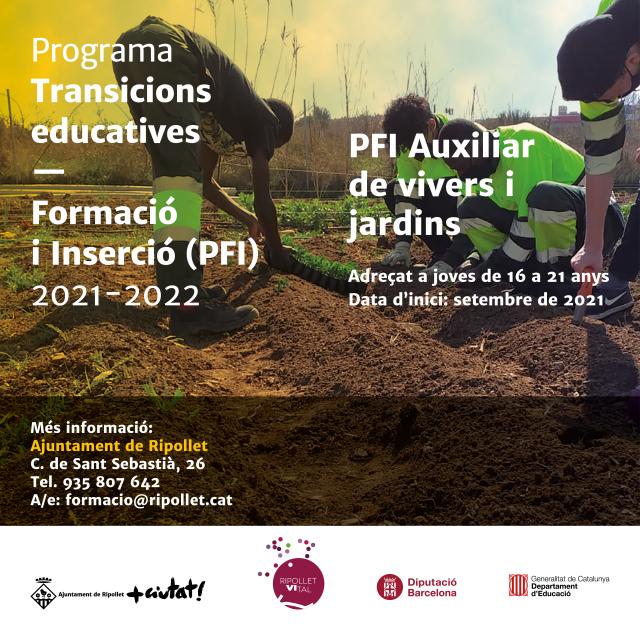 El Programa de Formació I Inserció - PFI, que es va iniciar l'octubre de 2020 amb dues noves especialitats - Auxiliar d'hoteleria: cuina i càtering i Auxiliar de vivers i jardins- mantindrà pel curs vinent l'oferta formativa. Les noves especialitats s'emmarquen en el projecte Ripollet Vital, que vol desplegar una nova línia formativa i ocupacional vinculada al cultiu de la vinya i al vi, així com a aspectes com la sostenibilitat, el producte de proximitat i la visió de gènere. Ripollet Impulsa ja ha obert les preinscripcions del jovent que vol participar en el PFI 2021 - 2022. Durant els mesos de juny i juliol realitzaran el procés selectiu de les 15 places disponibles per a cada especialitat formativa, amb la previsió d'iniciar els cursos durant el mes de setembre. Aquest curs, han participat un total de 30 alumnes i 4 de cada 5 han manifestat la seva voluntat de continuar estudiant.