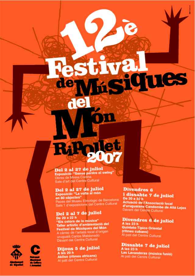 Dilluns 2 de juliol va començar a Ripollet el Festival de Músiques del Món, que aquest any arriba a la 12a edició. Aquest dimecres, 4 de juliol, a partir de dos quarts de vuit del vespre, el Centre Cultural inaugura les dues exposicions previstes pel festival: La volta el món en 80 objectes i Sense perdre el swing. El Patronat Municipal de Cultura i Joventut ha marcat com a objectiu principal de la mostra despertar sensibilitats mitjançant el coneixement i l'apropament a la riquesa cultural d'altres pobles, ja sigui des del més pur retrobament amb les arrels i els orígens o amb les músiques més tradicionals, i sobretot posant l'accent en les fusions de ritmes procedents de diferents indrets.