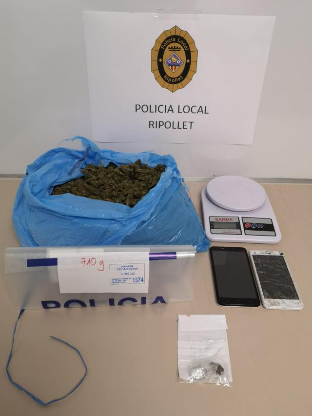 La matinada de dilluns, 12 de maig, durant la realització de les tasques habituals de vigilància, una patrulla de la Policia Local va procedir a identificar un jove al carrer dels Afores, que acabava de llençar una bossa entre dos vehicles i que se'ls va apropar corrents i en actitud nerviosa. Els agents van trobar a la bossa, amb més de 700 grams de flors de cànnabis i, molt a prop, una bàscula i dos mòbils. També portava 6,6 grams d'haixix.El jove va ser detingut per un delicte contra la salut pública i va passar a disposició dels Mossos d'Esquadra. La Policia Local també va efectuar una proposta de sanció per haver-se saltat el confinament. En el moment d'apropar-se al jove, la patrulla va veure com marxava a tota velocitat un vehicle, el quan no han pogut identificar.