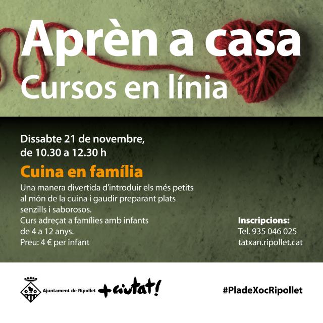 Activitat en línia, prevista inicialment al Centre Cultural. Adreçat a famílies amb infants de 4 a 12 anys. Preu: 4 € per infant (preu dels ingredients no inclòs). Inscripcions al Centre Cultural o a tatxan.ripollet.cat.