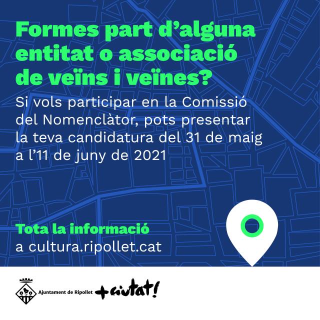 L'Ajuntament ha obert el període de presentació de les candidatures dels/les membres que formaran part de la Comissió de Nomenclàtor. Aquesta Comissió tindrà l'objectiu de nomenar les vies urbanes, espais públics d'interès, equipaments municipals i edificis amb valor històric i/o patrimonial de la ciutat.